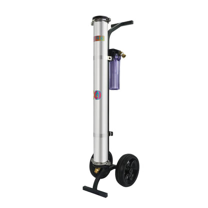 The XERO DI Cart - Single is made from high-quality materials and is built in-house by the XERO team to ensure it's perfect and ready to use right out of the box. The 40-inch DI cartridge sits inside a stainless steel housing securely mounted on a robust powder-coated steel frame. A pre-filter housing sits on the back to hold the 10-inch chloramine filter. To ensure smooth and hassle-free mobility across various terrains, this system is equipped with two no-flat wheels. Additionally, it utilizes brass garden hose fittings to ensure reliable and leak-free connections.